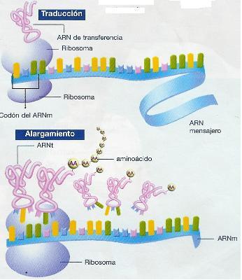 TRADUCCIÓN O SÍNTESIS DE PROTEÍNASLa síntesis de proteína es el proceso de producción o fabricación de las proteínas que necesitan las células para realizar sus funciones vitales. En el proceso se requieren:• Subunidades ribosómicas pequeñas y grandes.• Cadena de ARN mensajero (ARNm), que es el portador de las instrucciones codificadas que especifican la secuencia de aminoácidos.• ARN de transferencia (ARNt) encargado de transportar los aminoácidos a los ribosomas para incorporarlos a las proteínas.Cada molécula de proteína está formada por la combinación de muchos de los veintes diferentes aminoácidos que existen. Tres nucleótidos sucesivos (tripleta) determinan un aminoácido. A esta secuencia de tres nucleótidos se le conoce como codón. Por ejemplo, el triplete CAC (citocina, adenina, citocina) es el codón que se utiliza para fabricar el aminoácido histidina, mientras que usando AGA (Adenina, guanina, adenina) obtienen el aminoácido arginina.La forma como se encuentran dispuestos los nucleótidos en la molécula de ADN determina la secuencia de aminoácidos que formara una proteína en particular.Se fija un ARNm a la subunidad pequeña del ribosoma, después se une el ARNt a este complejo entre el ARNm y el ribosoma, dando inicio a la traducción. Después la subunidad grande se une con la subunidad pequeña, de la misma, manera que colocas entre las dos partes de una grapadora al graparlas.El proceso de alargamiento, con la adición de un segundo ARN de trasferencia y su respectivo aminoácido. El proceso se repite una y otra vez de manera que se forman largas cadenas de aminoácidos unidos, llamados péptidos