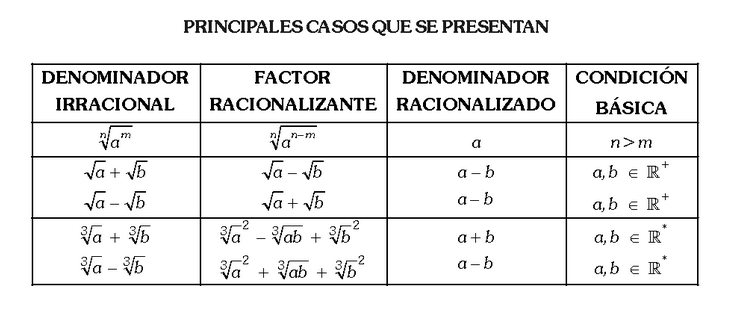 En la racionalización de expresiones con denominadores irracionales se deben tener en cuenta las siguientes situaciones: