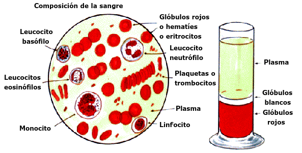 La sangre está constituida por un líquido, el plasma, y por las células sanguíneas. Las células sanguíneas son de tres tipos: eritrocitos o glóbulos rojos, leucocitos o glóbulos blancos y plaquetas.